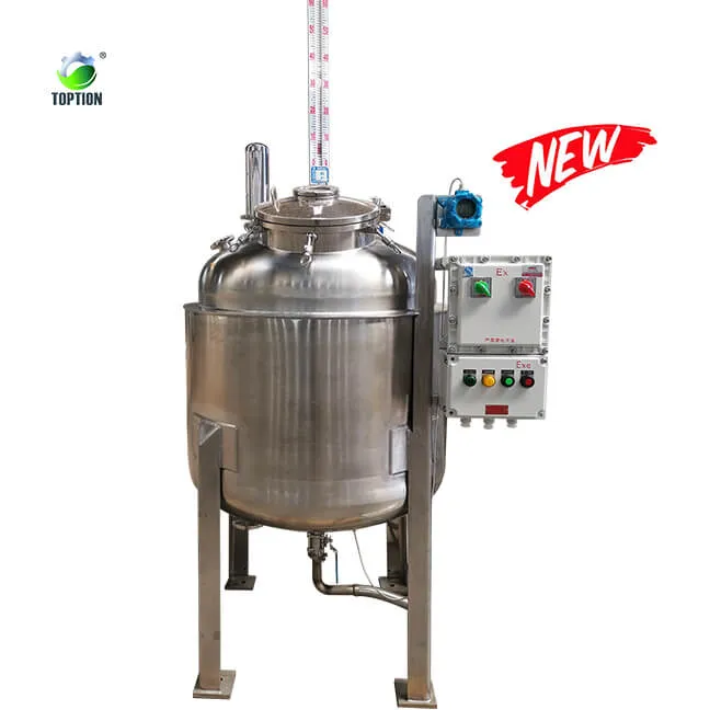 Le réservoir de stockage en acier inoxydable TOPTION prend en charge la personnalisation professionnelle, la double couche, la monocposition et la personnalisation de la gamme de capacités. Pour prégeler l’alcool avant l’extraction centrifuge de l’éthanol, choisissez un réfrigérateur assorti à double couche pour obtenir l’effet prégelé. Pour le stockage liquide après filtration, un réservoir de stockage à couche unique est sélectionné, qui est principalement utilisé pour la mise en mémoire tampon avant d’entrer dans l’évaporateur pour atteindre l’objectif d’une alimentation stable et continue.